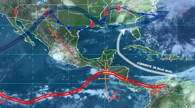 Las precipitaciones serán causadas por la Onda Tropical Número 1, que se localizará sobre el sureste del país, un canal de baja presión ubicado en el interior de la República Mexicana, en interacción con la entrada de humedad proveniente de ambo océanos.