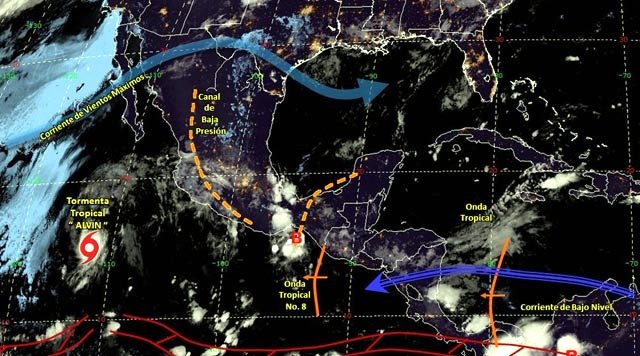 Las condiciones mencionadas serán originadas por los desprendimientos nubosos de la tormenta tropical Alvin, un canal de baja presión sobre el interior de México, que interaccionará con la Onda Tropical Número 8 al sur de las costas de Oaxaca y con una nueva onda tropical que se aproximará por la noche al sur de la Península de Yucatán.