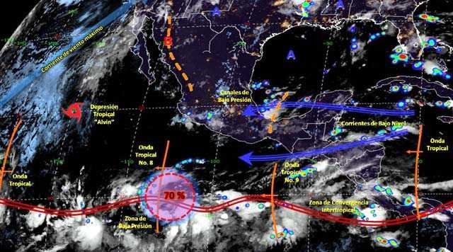 Durante esta madrugada, Alvin, se debilitó a depresión tropical, se localizó frente a la costa occidental de la Península de Baja California, a 925 kilómetros (km) al oeste-suroeste de Cabo San Lázaro y a mil 75 km al oeste-suroeste de Cabo San Lucas, ambos en Baja California Sur, con vientos máximos sostenidos de 45 km/h, rachas de 65 km/h y desplazamiento al oeste- noroeste a 13 km/h. Ninguno de estos dos sistemas genera efectos en México.