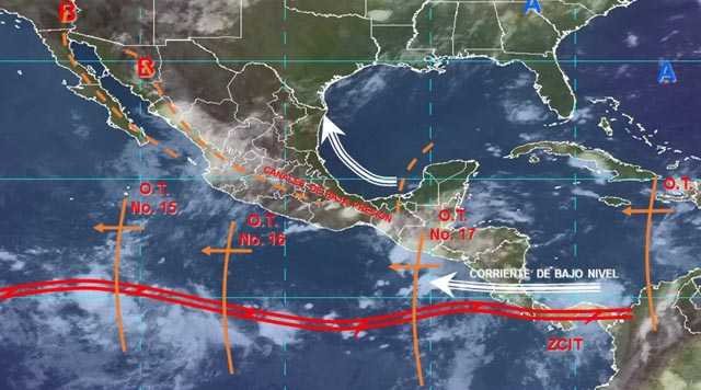 Esas condiciones serán originadas por las ondas tropicales 16 y 17 ubicadas frente a las costas de Colima y Michoacán y el sureste de la República, respectivamente, en interacción con canales de baja presión que se localizan en el noroeste, el occidente, el sur y el sureste de México e inestabilidad atmosférica en altura.