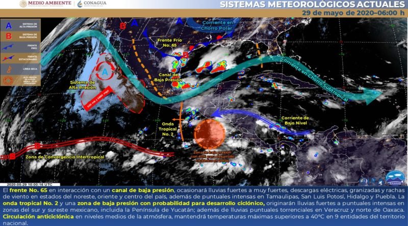 Este día el frente No. 65 en interacción con un canal de baja presión sobre el oriente de México, ocasionará lluvias fuertes a muy fuertes en los estados del noreste, oriente y centro del país, además de puntuales intensas en Tamaulipas, San Luis Potosí, Hidalgo y Puebla, todas acompañadas de descargas eléctricas, granizadas y rachas de viento durante el paso de las tormentas. La onda tropical No. 2, será absorbida por una zona de baja presión con probabilidad para desarrollo ciclónico y originará lluvias fuertes a puntuales intensas en zonas del sur y sureste mexicano, incluida la Península de Yucatán, además de lluvias puntuales torrenciales en Veracruz y norte de Oaxaca; precipitaciones que podrían generar posibles deslaves, aumento en los caudales de ríos y arroyos e inundaciones en zonas bajas de dichos estados. Finalmente, una circulación anticiclónica en niveles medios de la atmósfera, mantendrá temperaturas máximas superiores a 40°C en 9 entidades del territorio nacional.