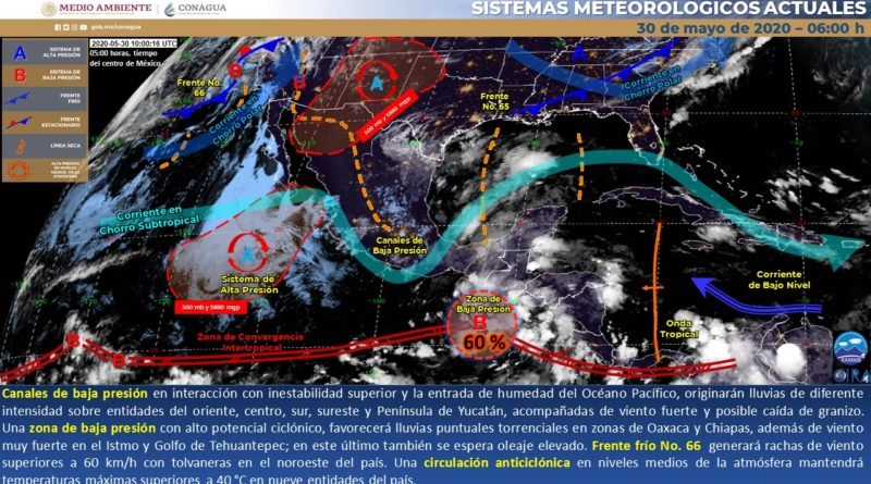 Pacífico Sur: Cielo nublado con lluvias puntuales torrenciales en Oaxaca y Chiapas, así como fuertes en Guerrero, todas con descargas eléctricas, vientos fuertes y posible caída de granizo. Ambiente caluroso en zonas costeras y viento de dirección variable de 15 a 30 km/h en la región, con rachas de 80 a 90 km/h en el Istmo y Golfo de Tehuantepec, además de oleaje elevado de 2 a 3 metros de altura en el Golfo de Tehuantepec. Las precipitaciones podrían generar posibles deslaves, aumento en los caudales de ríos y arroyos e inundaciones en zonas bajas de dichos estados.