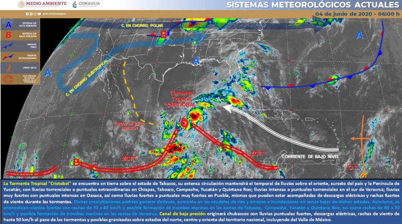 Para hoy la Tormenta tropical «Cristobal» se desplazará sobre tierra en el estado de Campeche, durante gran parte del día, manteniendo el temporal de lluvias en el sureste mexicano, con lluvias puntuales extraordinarias en Yucatán y Quintana Roo; lluvias puntuales torrenciales en Campeche, Chiapas y Tabasco; puntuales intensas en Veracruz y Oaxaca, así como muy fuertes en Puebla. Dichas precipitaciones podrían generar deslaves, aumento en los caudales de ríos y arroyos e inundaciones en zonas bajas de dichos estados. Asimismo se pronostican rachas fuertes de viento de 70 a 80 km/h y posible formación de trombas marinas en Tabasco, Campeche, Yucatán y Quintana Roo, así como velocidades de 60 a 70 km/h en la costa de Veracruz. Por otro lado un canal de baja presión, en interacción con el ingreso de humedad del Océano Pacífico y Golfo de México, originará por la tarde chubascos con lluvias puntuales fuertes acompañadas de descargas eléctricas, rachas de viento al paso de las tormentas y posibles granizadas sobre los estados del norte, occidente y centro del país, incluyendo el Valle de México. Finalmente continuarán las temperaturas máximas superiores a 40°C en 8 entidades del país.