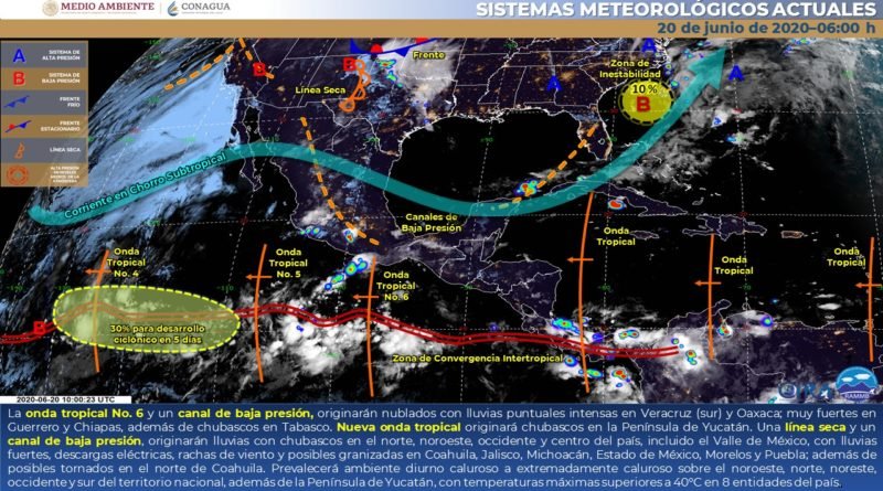 Este día la onda tropical No. 6 interaccionará con un canal de baja presión y originará el desarrollo de nublados densos con lluvias puntuales intensas en Veracruz (sur) y Oaxaca; muy fuertes en Guerrero y Chiapas, además de chubascos en Tabasco y la Península de Yucatán, condiciones que serán reforzadas por la aproximación de una nueva onda tropical a dicha Península. Por otra parte, una línea seca sobre el norte de México, en interacción con un canal de baja presión, originarán lluvias con chubascos en el norte, noroeste, occidente y centro del país, incluido el Valle de México, con lluvias fuertes en Coahuila, Jalisco, Michoacán, Estado de México, Morelos y Puebla, acompañadas de descargas eléctricas, rachas de viento durante el paso de las tormentas y posibles granizadas, además de probabilidad para formación de tornados en el norte de Coahuila. Adicionalmente, prevalecerá ambiente diurno caluroso a extremadamente caluroso sobre el noroeste, norte, noreste, occidente y sur del territorio nacional, además de la Península de Yucatán, con temperaturas máximas superiores a 40°C en 8 entidades del país.