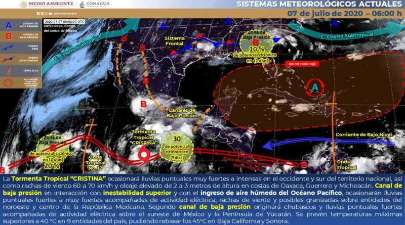 Para hoy, la amplia circulación de la tormenta tropical “CRISTINA”, misma que se ubica frente a las costas de Guerrero y Michoacán, ocasionará lluvias puntuales muy fuertes a intensas en el occidente y sur del territorio nacional, así como rachas de viento 60 a 70 km/h y oleaje elevado de 2 a 3 metros de altura sobre las costas de Oaxaca, Guerrero y Michoacán, además de aportar inestabilidad atmosférica al centro del país.