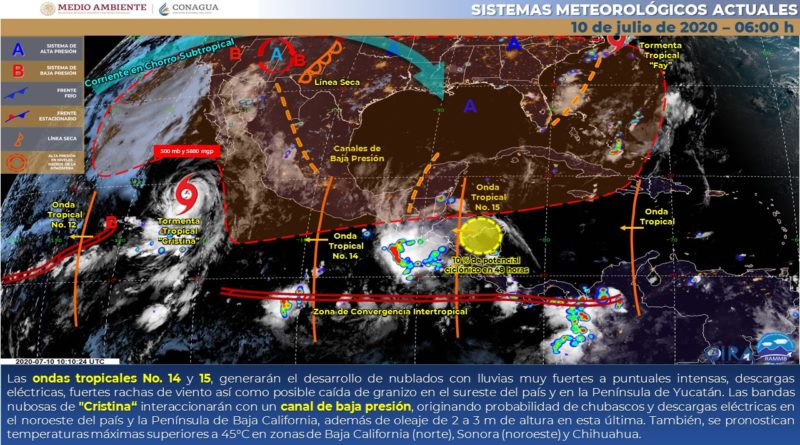 Este día, la onda tropical No. 14 se extenderá al sur de Michoacán, en tanto que la nueva onda tropical No. 15 recorrerá la Península de Yucatán; ambos sistemas generarán durante la tarde, desarrollo de nublados con lluvias muy fuertes a puntuales intensas, descargas eléctricas, fuertes rachas de viento así como posible caída de granizo en el sureste del país y en dicha península. Por otra parte, el centro de «Cristina» se localizará al oeste-suroeste de Baja California Sur, sus bandas nubosas interaccionarán con un canal de baja presión sobre el noroeste del país y la Península de Baja California, originando probabilidad de chubascos y descargas eléctricas en dicha región. También, se pronostican temperaturas máximas superiores a 45°C en zonas de Baja California (norte), Sonora (noroeste) y Chihuahua.