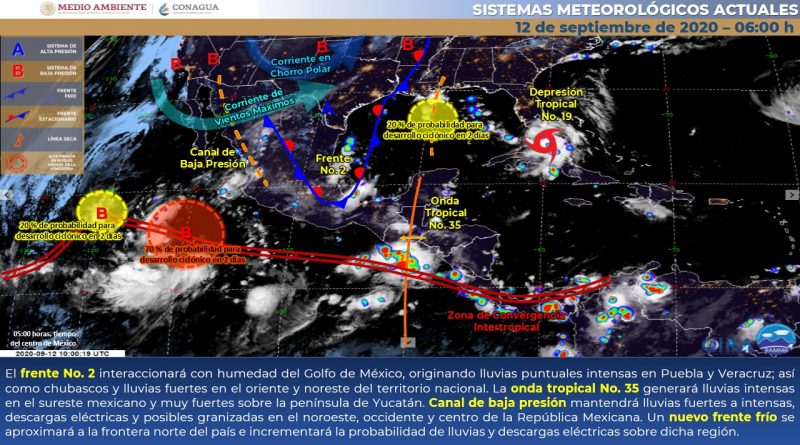 Este día, el frente No. 2 se disipará sobre el noreste de México; sin embargo, interaccionará con la humedad del Golfo de México, originando lluvias puntuales intensas en Puebla y Veracruz; así como chubascos con lluvias puntuales fuertes en el oriente y noreste del territorio nacional. La onda tropical No. 35 avanzará lentamente al sur de la Península de Yucatán, generando lluvias intensas en el sureste mexicano y muy fuertes sobre dicha península. Canal de baja presión mantendrá lluvias fuertes a intensas, acompañadas de descargas eléctricas y posibles granizadas en el noroeste, occidente y centro de la República Mexicana. Finalmente, un nuevo frente frío se aproximará a la frontera norte del país e incrementará la probabilidad de lluvias acompañadas de descargas eléctricas sobre dicha región.
