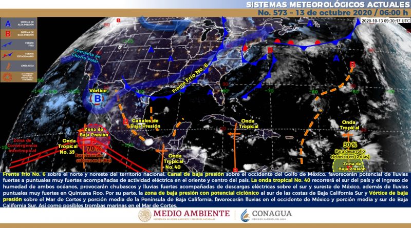 Para hoy, el frente frío No. 6 se localizará sobre el norte y noreste del territorio nacional, interaccionará con un canal de baja presión que se extenderá sobre el occidente del Golfo de México, ocasionando potencial de lluvias fuertes a puntuales muy fuertes acompañadas de actividad eléctrica en el oriente y centro del país. Mientras que, la onda tropical No. 40 recorrerá el sur del país, en combinación con el ingreso de humedadde ambos océanos, provocarán chubascos y lluvias fuertes acompañadas de descargas eléctricas sobre el sur y sureste de México, además de lluvias puntuales muy fuertes en Quintana Roo. Por su parte, la zona de baja presión con potencial ciclónico al sur de las costas de Baja California Sur y Vórtice de baja presión sobre el Mar de Cortes y porción media de la Península de Baja California, favorecerán lluvias en el occidente de México y porción media y sur de Baja California Sur. Asi como posibles trombas marinas en el Mar de Cortes. Finalmente, se mantendrá ambiente frío por la mañana con temperaturas mínimas por debajo de los 5°C y heladas matutinas en zonas altas de la Mesa del Norte y la Mesa Central.