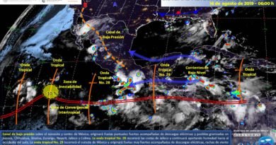 Este día, el frente No. 7 se disipará sobre el oriente del Golfo de México, mientras que la masa de aire asociada, modificará sus características térmicas dejando de afectar al territorio nacional. Por la tarde, canales de baja presión sobre el occidente, centro, oriente y sureste del país, así como en la Península de Yucatán, en interacción con la entrada de humedad del Océano Pacífico, Golfo de México y Mar Caribe, originarán nublados y lluvias acompañadas de descargas eléctricas sobre dichas regiones, incluido el Valle de México.