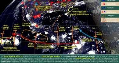 Península de Yucatán: Cielo nublado durante el día, con lluvias puntuales fuertes y descargas eléctricas en la región. Ambiente caluroso. Viento del norte y noreste de 15 a 30 km/h con rachas de 45 km/h en las costas de Yucatán.