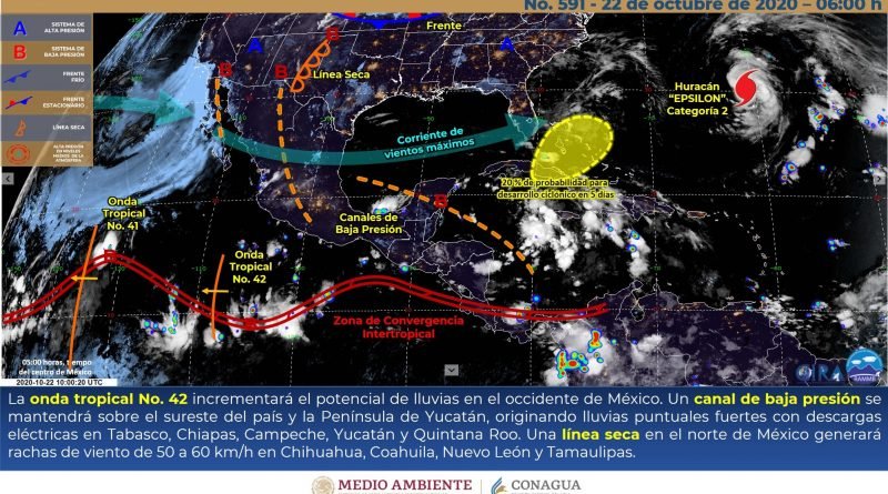 Este día, la onda tropical No. 42 se localizará al sur de las costas de Baja California Sur, incrementando el potencial de lluvias en el occidente de México. Un canal de baja presión se mantendrá sobre el sureste del país y la Península de Yucatán, originando lluvias puntuales fuertes con descargas eléctricas en Tabasco, Chiapas, Campeche, Yucatán y Quintana Roo. Finalmente, una línea seca en el norte de México continuará generando rachas de viento de 50 a 60 km/h en Chihuahua, Coahuila, Nuevo León y Tamaulipas.