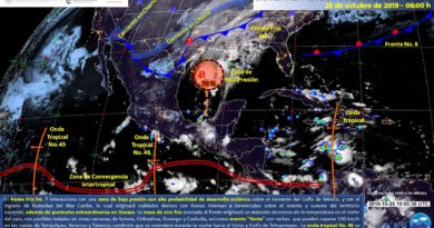 Para hoy, el sistema frontal No. 12 afectará el norte y noreste del país, propiciando vientos fuertes con tolvaneras sobre dichas regiones, así como descenso en las temperaturas. Por otro lado, la tormenta tropical “Eta” continuará desplazándose hacia el norte, dejando de afectar paulatinamente la Península de Yucatán, sin embargo aún dejara puntuales fuertes en el norte de dicha Península. Un canal de baja presión sobre el sureste de México, ocasionará lluvias puntuales fuertes en esa región. Finalmente, en entidades de la Mesa del Norte y Mesa Central continuará el ambiente frío a muy frío durante la mañana y noche, con posibilidad de heladas matutinas en zonas serranas.