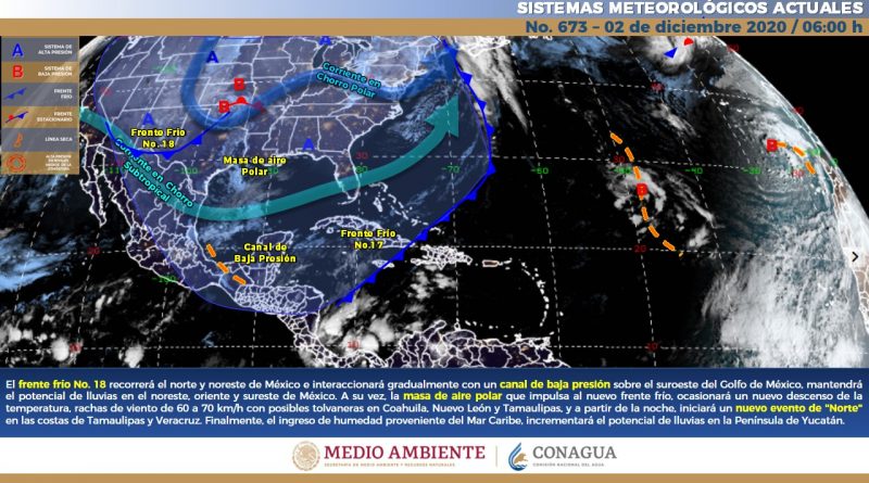 Para hoy, el frente frío No. 18 recorrerá el norte y noreste de México e interaccionará gradualmente con un canal de baja presión sobre el suroeste del Golfo de México, mantendrá el potencial de lluvias en el noreste, oriente y sureste de México. A su vez, la masa de aire polar que impulsa al nuevo frente frío, ocasionará un nuevo descenso de la temperatura, rachas de viento de 60 a 70 km/h con posibles tolvaneras en Coahuila, Nuevo León y Tamaulipas, y a partir de la noche, iniciará un nuevo evento de «Norte» en las costas de Tamaulipas y Veracruz. Finalmente, el ingreso de humedad proveniente del Mar Caribe, incrementará el potencial de lluvias en la Península de Yucatán.