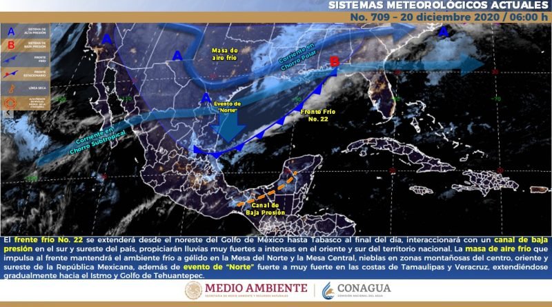 Para hoy, el frente frío No. 22 se extenderá desde el noreste del Golfo de México hasta Tabasco, interaccionará con un canal de baja presión en el sur y sureste del país, propiciarán lluvias muy fuertes a intensas en el oriente y sur del territorio nacional. La masa de aire frío que impulsa al frente mantendrá el ambiente frío a gélido en la Mesa del Norte y la Mesa Central, nieblas en zonas montañosas del centro, oriente y sureste de la República Mexicana, además de evento de “Norte” fuerte a muy fuerte en las costas de Tamaulipas y Veracruz, extendiéndose gradualmente hacia el Istmo y Golfo de Tehuantepec.