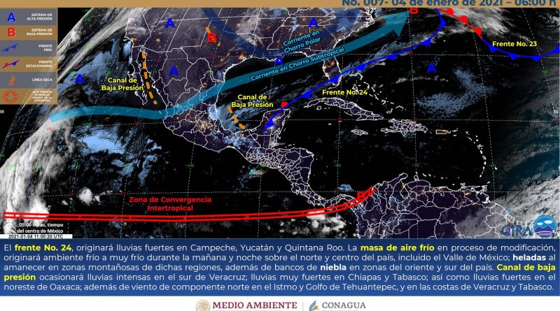 Este día, el frente No. 24 continuará extendido con características de estacionario sobre la Península de Yucatán, manteniendo probabilidad de lluvias puntuales fuertes en Campeche, Yucatán y Quintana Roo. La masa de aire frío asociada al frente y en proceso de modificación, originará ambiente frío a muy frío durante la mañana y noche sobre los estados del norte y centro del país, incluido el Valle de México; heladas al amanecer en zonas montañosas de dichas regiones, además de bancos de niebla en zonas altas de San Luis Potosí, Veracruz, Puebla y Oaxaca. Finalmente, un canal de baja presión se extenderá sobre el sureste mexicano y ocasionará lluvias puntuales intensas en el sur de Veracruz; lluvias puntuales muy fuertes en Chiapas y Tabasco; así como lluvias puntuales fuertes en el noreste de Oaxaca, además de viento de componente norte en el Istmo y Golfo de Tehuantepec, y en las costas de Veracruz y Tabasco.