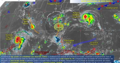 Península de Yucatán: Cielo nublado con lluvias puntuales fuertes en Quintana Roo e intervalo de chubascos en Campeche y Yucatán, ambiente cálido y viento del este y noreste de 15 a 30 km/h con rachas de 40 km/h.