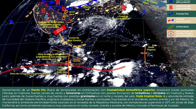 Este día, un frente frío (fuera de temporada) ingresará en el norte de México y en combinación con inestabilidad atmosférica superior, provocará lluvias puntuales intensas en Coahuila, rachas de viento fuertes a intensas y tolvaneras en Chihuahua, con posible formación de torbellinos o tornados en Coahuila y Nuevo León; además de lluvias fuertes a muy fuertes, descargas eléctricas y posibles granizadas en el norte y noreste del país. Por otra parte, la onda tropical Núm. 4 recorrerá el sur y centro del territorio nacional y asociada con abundante entrada de humedad del Océano Pacífico, originará chubascos y lluvias fuertes a puntuales muy fuertes en zonas del occidente, centro, oriente y sur de la República Mexicana. Finalmente, se mantendrá el ambiente extremadamente caluroso en el noroeste de la República Mexicana, con temperaturas superiores a 45°C en zonas de Baja California, así como ambiente caluroso a muy caluroso en zonas del norte, noreste, oriente y sureste de México, incluida la Península de Yucatán.