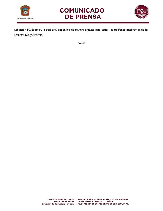 La Fiscalía General de Justicia estatal hace un llamado a la ciudadanía para que en caso de que reconozca a estas personas como probables partícipes de algún otro delito, sean denunciadas a través del correo electrónico cerotolerancia@edomex.gob.mx, al número telefónico 800 7028770, o bien, por medio de la aplicación FGJEdomex, la cual está disponible de manera gratuita para todos los teléfonos inteligentes de los sistemas iOS y Android.