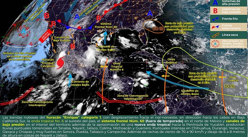 Para hoy, el centro del huracán «Enrique» categoría 1, con desplazamiento hacia el nor-noroeste, cerca de las costas de Jalisco, Nayarit y Sinaloa, la onda tropical No. 6 al sureste del país, el sistema frontal No. 60 (fuera de temporada) extendido en el norte de México y canales de baja presión en el interior del territorio además de la aproximación de una nueva onda tropical hacia la Península de Yucatán; estos sistemas producirán lluvias puntuales torrenciales en Sinaloa, Nayarit, Jalisco, Colima, Michoacán y Guerrero. Puntuales intensas en Chihuahua, Durango, Veracruz, Oaxaca y Chiapas y muy fuertes en Sonora, Puebla, Tabasco y Campeche. Además de rachas de viento de 70 a 90 km/h y oleaje de 6 a 8 metros de altura en costas de Nayarit y Jalisco. Finalmente, se pronostican temperaturas máximas superiores a 40°C en zonas de Baja California y Sonora.