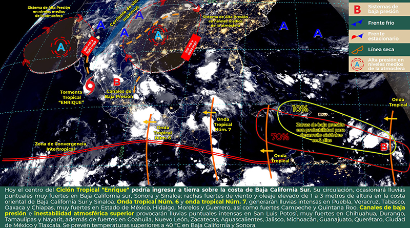 Para hoy, el ciclón tropical «Enrique» que se localizará al sureste de Baja California Sur, inestabilidad atmosférica superior, la onda tropical Número 6 al occidente del territorio nacional, un canal de baja presión en el interior del país y la onda tropical Número 7, en el sureste del territorio nacional, ocasionarán lluvias puntuales intensas en San Luis Potosí, Puebla, Veracruz, Tabasco, Oaxaca y Chiapas; puntuales muy fuertes en Baja California Sur, Sonora, Sinaloa, Chihuahua, Durango, Tamaulipas, Estado de México, Hidalgo, Morelos, Nayarit y Guerrero. Además de rachas fuertes de viento en el sur de Baja California Sur y Sonora, oleaje de 1 a 3 metros de altura en Baja California Sur y Sinaloa. Finalmente, se prevén temperaturas superiores a 40 °C en Baja California y Sonora.