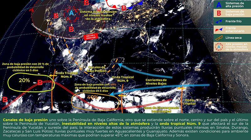Para el día de hoy, canales de baja presión uno sobre la Península de Baja California, otro que se extiende sobre el norte, centro y sur del país y el último sobre la Península de Yucatán, inestabilidad en niveles altos de la atmósfera y la onda tropical Núm. 9 que afectará el sur de la Península de Yucatán y sureste del país; la interacción de estos sistemas producirán lluvias puntuales intensas en Sinaloa, Durango, Zacatecas y San Luis Potosí; lluvias puntuales muy fuertes en Aguascalientes, Guanajuato y Michoacán. Además existen condiciones para ambiente muy caluroso con temperaturas máximas que podrían superar 45°C en zonas de Baja California y Sonora.