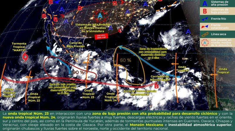 Para información de la Tormenta Tropical «Marty» y de la zona de baja presión con potencial ciclónico en el Océano Pacífico, así como de las zonas de inestabilidad y de baja presión con potencial ciclónico en el Océano Atlántico, consultar los avisos del Servicio Meteorológico Nacional en: