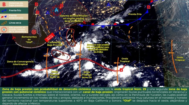 Este día, una zona de baja presión con probabilidad de desarrollo ciclónico asociada con la onda tropical Núm. 29 se localizará sobre el Golfo de Tehuantepec; una segunda zona de baja presión con potencial ciclónico se desplazará hacia el suroeste del Golfo de México e interaccionará con un canal de baja presión en esa región; dichos sistemas originarán lluvias puntuales torrenciales en Veracruz y Oaxaca, lluvias fuertes a intensas sobre el noreste, oriente, sur y sureste del país, así como en la Península de Yucatán, las cuales podrían generar incremento en los niveles de ríos y arroyos, deslaves e inundaciones. Prevalecerá ambiente muy caluroso en el noroeste y noreste del territorio nacional con temperaturas superiores a 40°C en Baja California y Sonora. Finalmente,“Olaf” se desplazará hacia el oeste, alejándose y dejando de afectar a México.