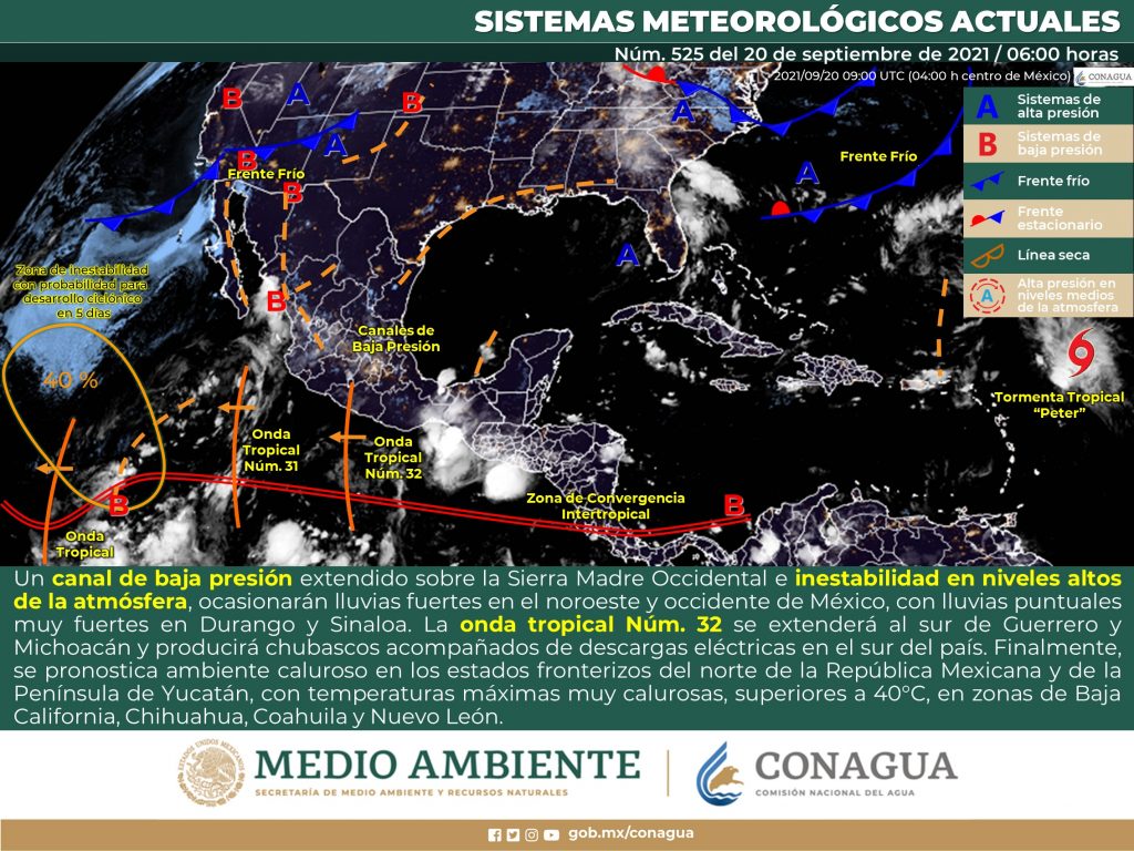 Para hoy, un canal de baja presión extendido sobre la Sierra Madre Occidental e inestabilidad en niveles altos de la atmósfera, ocasionarán lluvias fuertes en el noroeste y occidente de México, con lluvias puntuales muy fuertes en Durango y Sinaloa. La onda tropical Núm. 32 se extenderá al sur de Guerrero y Michoacán y producirá chubascos acompañados de descargas eléctricas en el sur del país. Finalmente, se pronostica ambiente caluroso en los estados fronterizos del norte de la República Mexicana y de la Península de Yucatán, con temperaturas máximas muy calurosas, superiores a 40°C, en zonas de Baja California, Chihuahua, Coahuila y Nuevo León.
