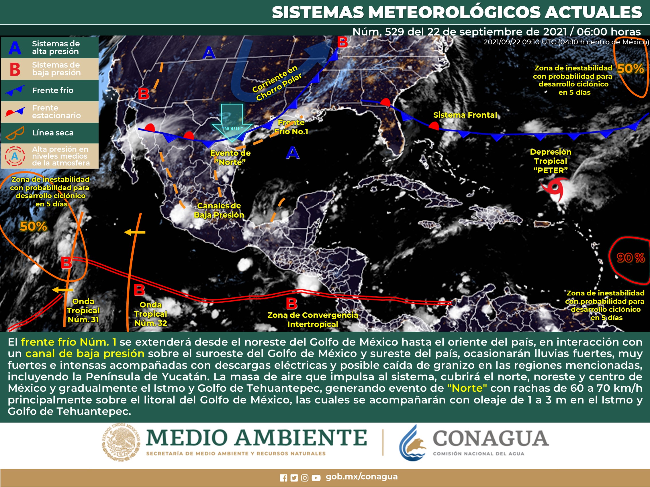 Para hoy, el frente frío Núm.1 se extenderá desde el noreste del Golfo de México hasta el oriente del territorio nacional, mantendrá interacción con un canal de baja presión sobre el suroeste del Golfo de México y sureste del país. Dichos sistemas ocasionarán lluvias puntuales fuertes, muy fuertes e intensas acompañadas con descargas eléctricas y posible caída de granizo en las regiones mencionadas, incluyendo la Península de Yucatán. La masa de aire que impulsa al sistema, cubrirá el norte, noreste y centro del territorio nacional y gradualmente el Istmo y Golfo de Tehuantepec, generando evento de «Norte» con rachas de 60 a 70 km/h principalmente sobre el litoral del Golfo de México, las cuales se acompañarán con oleaje de 1 a 3 m en el istmo y Golfo de Tehuantepec.