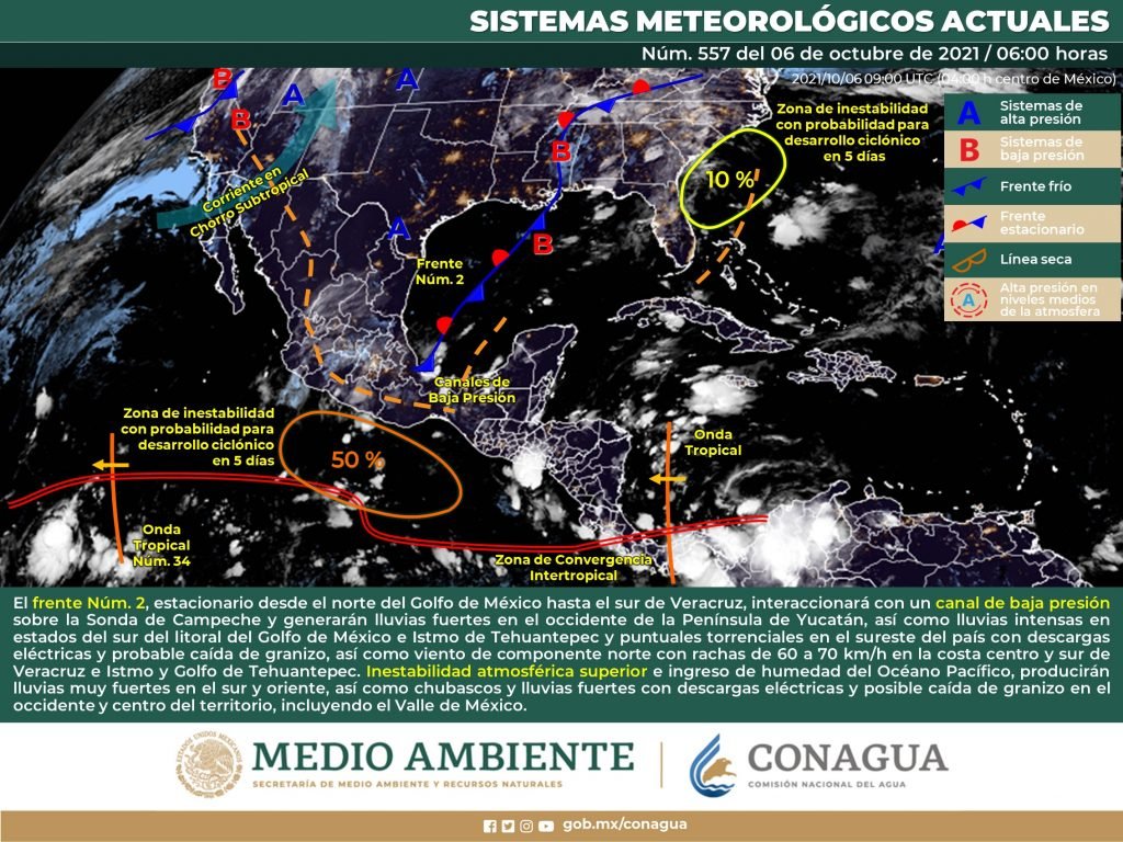 Para hoy, el frente Núm. 2, estacionario desde el norte del Golfo de México hasta el sur de Veracruz, interaccionará con un canal de baja presión sobre la Sonda de Campeche, lo que generará lluvias puntuales fuertes en el occidente de la Península de Yucatán, así como valores puntuales de lluvias intensas en estados del sur del litoral del Golfo de México e Istmo de Tehuantepec y puntuales torrenciales en el sureste del país, acompañadas de descargas eléctricas y probable caída de granizo, las cuales podrán generar incremento en los niveles de ríos y arroyos, deslaves e inundaciones en zonas de Chiapas, Oaxaca, Veracruz y Tabasco, así como viento de componente norte con rachas de 60 a 70 km/h en la costa centro y sur de Veracruz, e Istmo y Golfo de Tehuantepec. Por otra parte, inestabilidad atmosférica superior e ingreso de humedad del Océano Pacífico, producirán lluvias puntuales muy fuertes en el sur y oriente de la República Mexicana, así como chubascos y lluvias puntuales fuertes con descargas eléctricas y posible caída de granizo en el occidente y centro del territorio, incluyendo el Valle de México. Finalmente, prevalecerá el ambiente vespertino caluroso sobre entidades del noroeste y sur de México, así como en la Península de Yucatán.