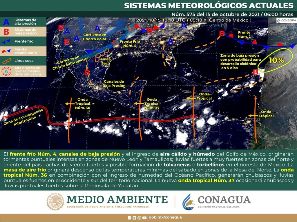Este día, el frente frío Núm. 4 se extenderá sobre el norte y noreste de México, interaccionará con canales de baja presión y con el ingreso de aire cálido y húmedo del Golfo de México, originando tormentas puntuales intensas que podrán generar incremento en los niveles de ríos y arroyos, deslaves e inundaciones en zonas de  Nuevo León y Tamaulipas; lluvias fuertes a muy fuertes en zonas del norte y oriente del país; rachas de viento fuertes y posible formación de tolvaneras o torbellinos en el noreste de México. La masa de aire frío asociada al frente originará descenso de las temperaturas mínimas del sábado en zonas de la Mesa del Norte. Por otra parte, la onda tropical Núm. 36 se desplazará al suroeste de las costas de Jalisco y Colima, en combinación con el ingreso de humedad del Océano Pacífico generarán chubascos y lluvias puntuales fuertes en el occidente y sur del territorio nacional. Así mismo, la nueva onda tropical Núm. 37 ocasionará chubascos y lluvias puntuales fuertes sobre la Península de Yucatán.
