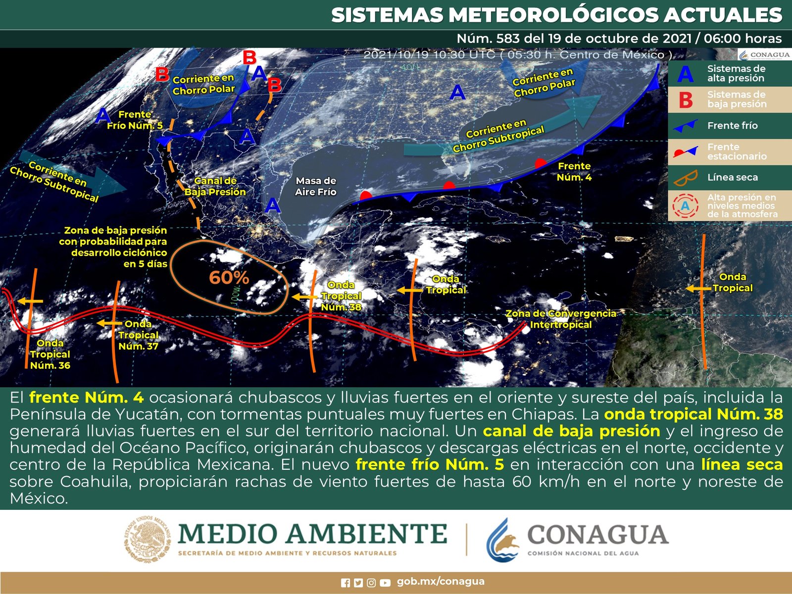 Este día, el frente Núm. 4 se extenderá con características de estacionario y en proceso de disipación sobre el oriente Golfo de México, sin embargo, ocasionará chubascos y lluvias fuertes en el oriente y sureste del país, incluida la Península de Yucatán, además de puntuales muy fuertes en Chiapas. La onda tropical Núm. 38 se desplazará al sur de las costas de Oaxaca, generando lluvias fuertes en el sur del territorio nacional. Asimismo, un canal de baja presión extendido a lo largo de la Sierra Madre Occidental y el ingreso de humedad del Océano Pacífico, originarán chubascos y descargas eléctricas en el norte, occidente y centro de la República Mexicana. Finalmente, el nuevo frente frío Núm. 5 sobre la frontera noroeste de México, en interacción con una línea seca sobre Coahuila, propiciarán rachas de viento fuertes de hasta 60 km/h en el noroeste, norte y noreste de México.