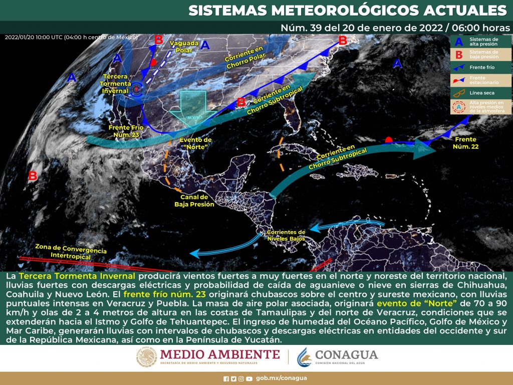 Para hoy, el desplazamiento de la Tercera Tormenta Invernal producirá vientos fuertes a muy fuertes y ambiente matutino muy frío a extremadamente frío sobre el norte y noreste del territorio nacional, lluvias fuertes con posibles descargas eléctricas que pueden generar incremento en los niveles de ríos y arroyos, así como deslaves e inundaciones en zonas bajas de Tamaulipas, Nuevo León y San Luis Potosí, además de probabilidad para la caída de aguanieve o nieve en sierras de Chihuahua, Coahuila y Nuevo León, extendiéndose durante la madrugada del viernes hacia las sierras del noroeste de Tamaulipas y San Luis Potosí. Por su parte, el rápido avance del frente frío núm. 23 originará chubascos sobre el centro y sureste mexicano, con lluvias puntuales intensas en Veracruz y Puebla. La masa de aire polar asociada, originará marcado descenso de temperatura en la Mesa del Norte, Mesa Central y oriente del territorio mexicano con heladas en zonas altas, así como evento de “Norte” de 70 a 90 km/h y olas de 2 a 4 metros de altura en las costas de Tamaulipas y del norte de Veracruz, condiciones que se extenderán hacia el Istmo y Golfo de Tehuantepec. A su vez, se prevé la posible caída de aguanieve o nieve en cimas montañosas con altitudes superiores a 4,000 metros sobre el nivel medio del mar en el centro y oriente de México (Estado de México, Tlaxcala, Puebla y Veracruz) durante la noche de hoy y madrugada del viernes. Por su parte, el ingreso de humedad del Océano Pacífico, Golfo de México y Mar Caribe, generarán lluvias con intervalos de chubascos acompañados de descargas eléctricas sobre entidades del occidente y sur de la República Mexicana, así como en la Península de Yucatán.