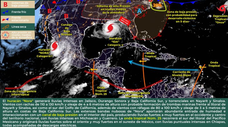 Read MoreEste día, los remanentes de «Nora» se mantendrán sobre el noroeste de México, originando condiciones para lluvias muy fuertes a intensas y vientos fuertes, además de